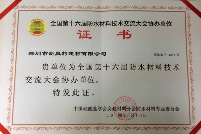 我公司協(xié)辦全國(guó)第十六屆防水材料技術(shù)交流大會(huì)證書(shū)