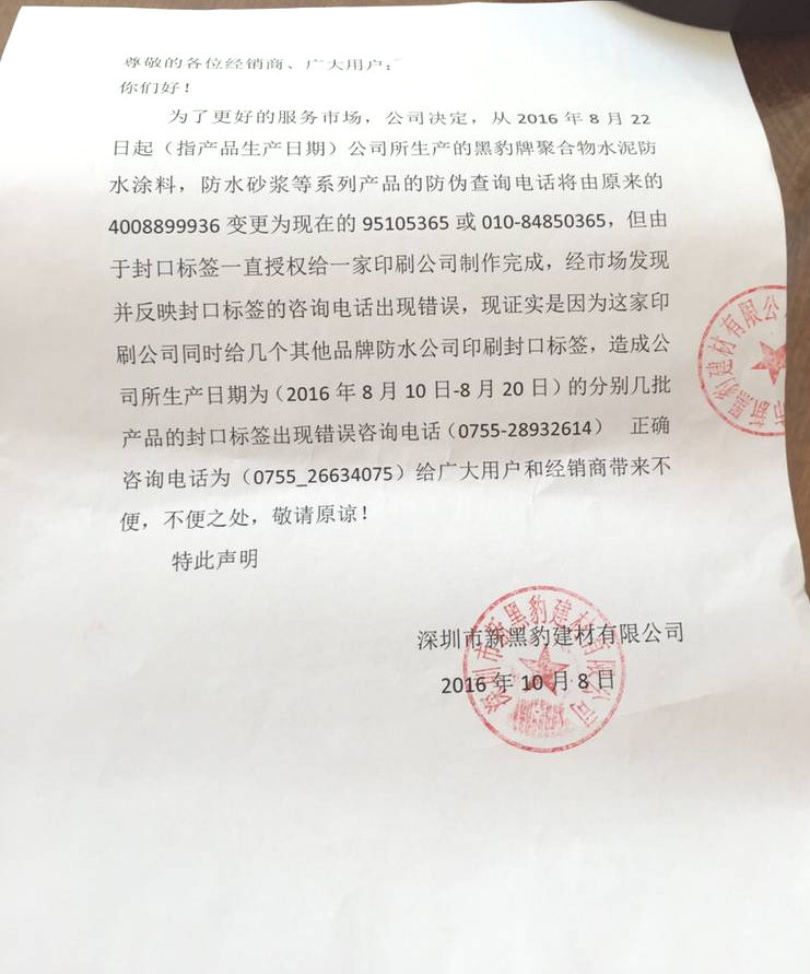 您們好,最近,有一些不法分子,假借我公司名譽私刻我公司公章,在社會上散發(fā)更改防偽查詢電話說明的文件(如下圖),說:“反映封口標簽的咨詢電話出現(xiàn)錯誤”、“是印刷公司同時給幾個其他品牌防水公司印刷封口標簽”所致,這簡直是一派胡言,我新黑豹建材有限公司,從來就沒有出現(xiàn)過這件事,沒有更換過封口條。我們只更換過防偽驗證碼,在更換時,工作非常仔細、非常嚴謹,都是提前一個多月告訴消費者。因此請廣大客戶千萬別上當,同時,我們也會保留對不法分子追究法律責任的權(quán)利。