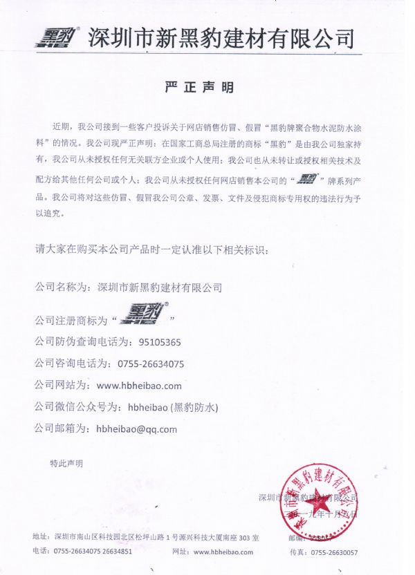 近期,我公司接到一些客戶投訴關(guān)于網(wǎng)店銷售仿冒、假冒“黑豹牌聚合物水泥防水涂料”的情況。我公司現(xiàn)嚴(yán)正聲明:在國家工商總局注冊的商標(biāo)“黑豹”是由我公司獨(dú)家持有,我公司從未授權(quán)任何無關(guān)聯(lián)方企業(yè)或個(gè)人使用;我公司也從未轉(zhuǎn)讓或授權(quán)相關(guān)技術(shù)及配方給其他任何公司或個(gè)人;我公司從未授權(quán)任何網(wǎng)店銷售本公司的“黑豹”牌系列產(chǎn)品。我公司將對這些仿冒、假冒我公司公章、發(fā)票、文件及侵犯商標(biāo)專用權(quán)的違法行為予以追究。 請大家在購買本公司產(chǎn)品時(shí)一定認(rèn)準(zhǔn)以下相關(guān)標(biāo)識: 公司名稱為:深圳市新黑豹建材有限公司 公司注冊商標(biāo)為“黑豹” 公司防偽查詢電話為:95105365 公司咨詢電話為:0755-26634075 公司網(wǎng)站為:m.ilovemynumnum.com 公司微信公眾號為:hbheibao (黑豹防水) 公司郵箱為:hbheibao@qq.com 特此聲明 深圳市新黑豹建材有限公司 二0一九年十月八日